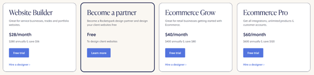 Rocketspark offers three paid plans—Website Builder ($28/month), Ecommerce Grow ($40/month), and Ecommerce Pro ($60/month).