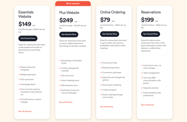 BentoBox offers a wide array of plans and packages to help you customize your experience. Their two main plans are the Essentials Website ($149/month + $1,000 setup) and the Plus Website ($249/month + $1,500 setup).