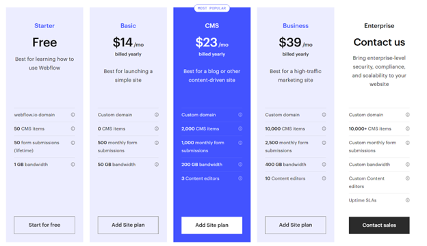 Webflow has a range of pricing plans—including Starter (free), Basic ($14/month), CMS ($23/month), Business ($39/month), and Enterprise (custom).