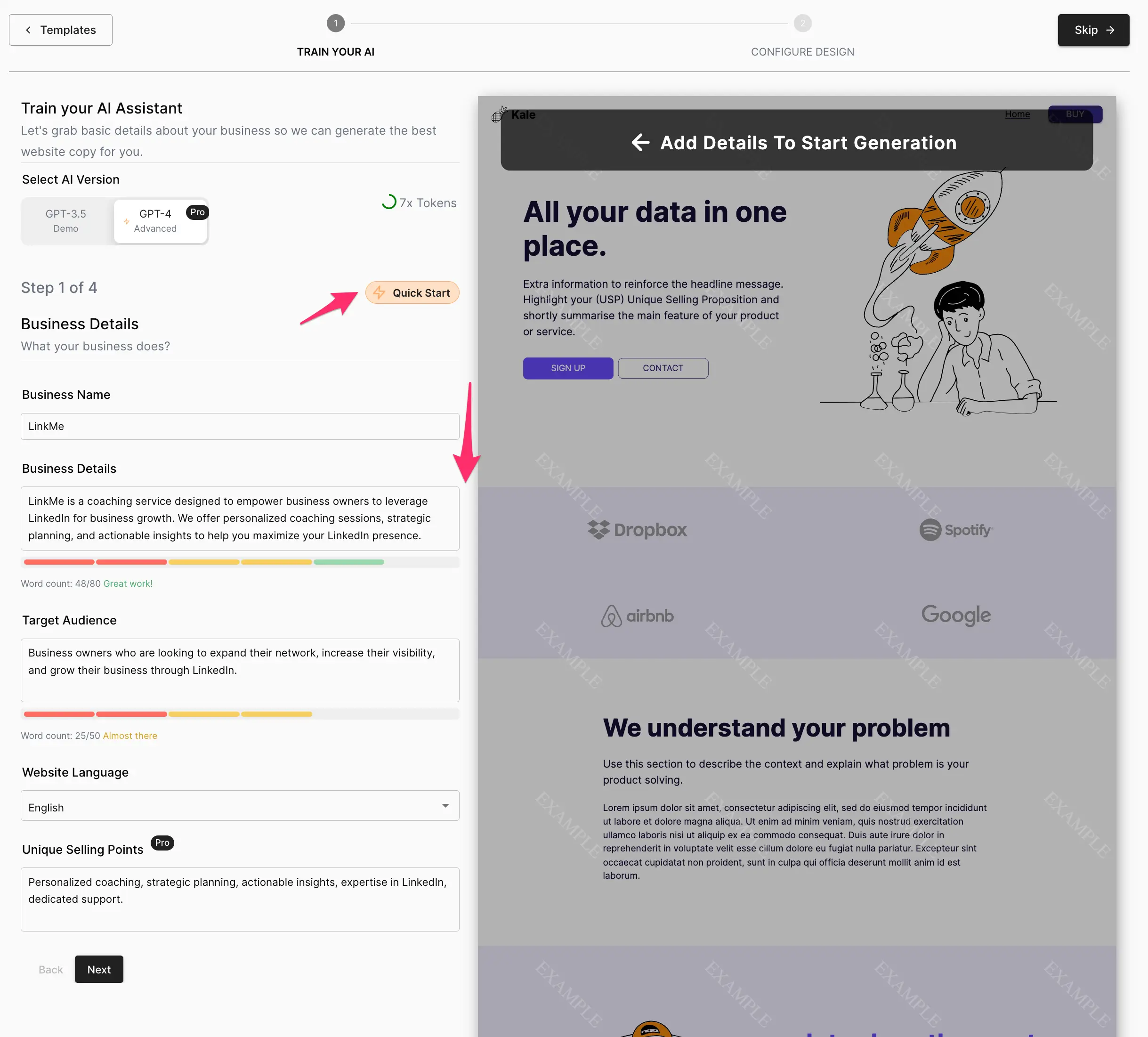 You can use our "Quick Start" button to pre-fill all the inputs required to train AI, then you can refine all the inputs as you want to match your business needs.