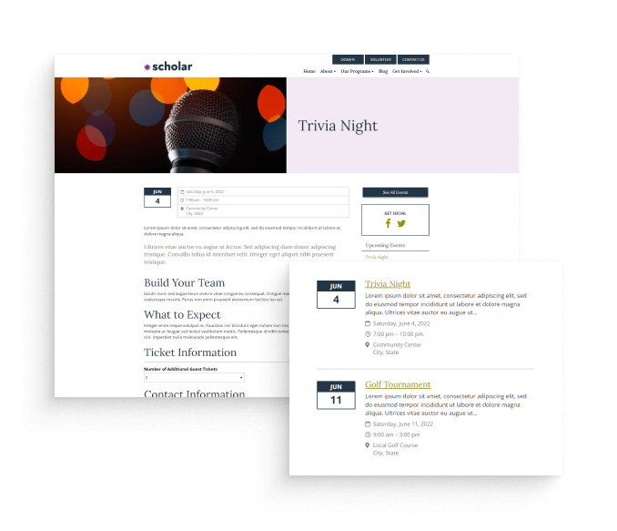 Each event that’s added to the system gets a dedicated page to help promote it and offer important details.