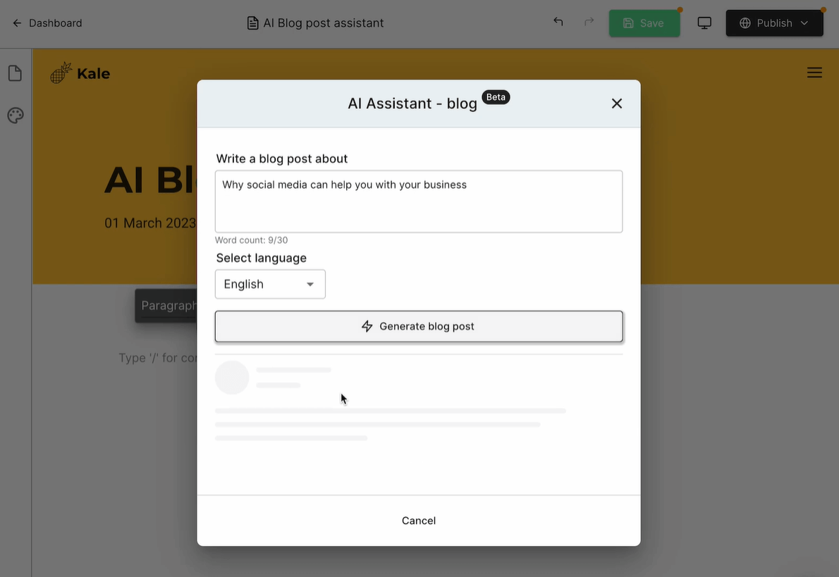 All you need to do to use our AI website-building features to write prompts in natural language. It’s super easy to get your business up and running when you can generate entire websites, sections, and blog posts by writing a 1–2 sentence prompt.