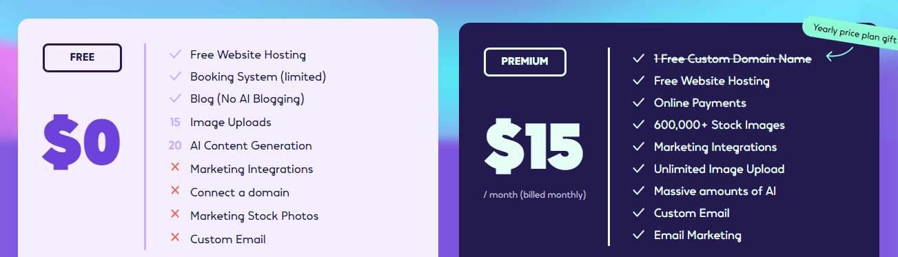 There’s a free plan with basic features, and a Premium plan ($15/month) which includes additional benefits like custom domains, online payments, unlimited image uploads, and more.