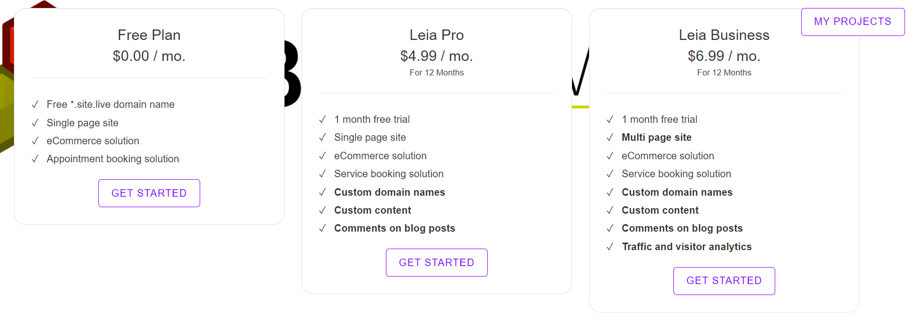 There are three plans available—Free, Leia Pro, and Leia Business. The Free plan offers a .site.live domain name, a single page site, and eCommerce and appointment booking solutions.