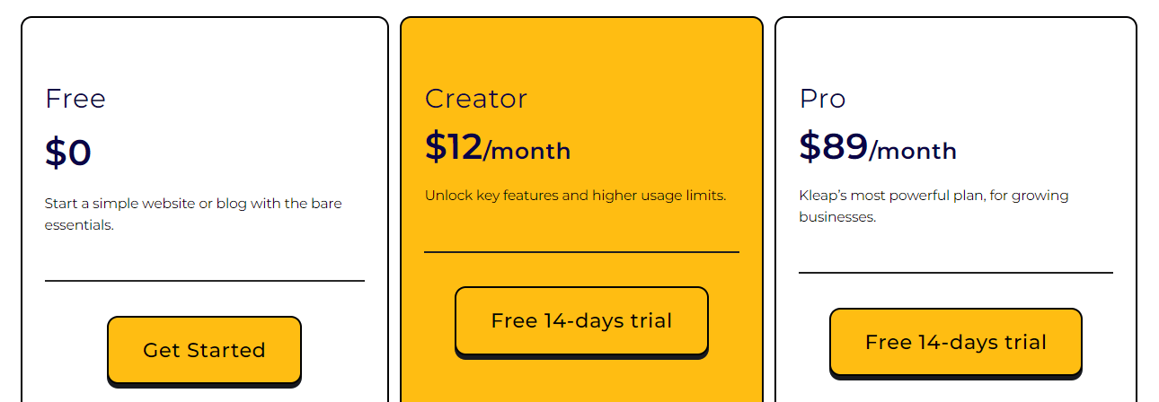 Kleap offers two pricing plans—Creator ($12/month) and Pro ($89/month).