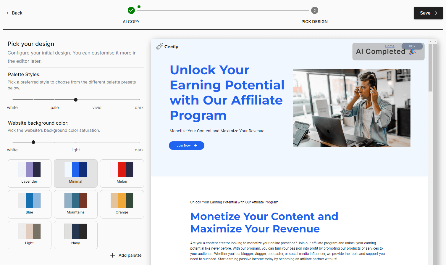 Our tool is packed with AI features that simplify the process. To get started, our AI Templates and AI Designer allow you to quickly create stunning webpages conversationally. You can also use AI to generate high-performing content that earns clicks and commissions, so you can make sure your website is optimized for affiliate success.