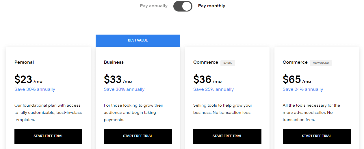 Squarespace offers a range of pricing plans for different needs. Their plans start from $23 per month for the Personal plan, $33 per month for the Business plan, and $36 per month for the Basic Commerce plan. The Advanced Commerce plan is priced at $65 per month.