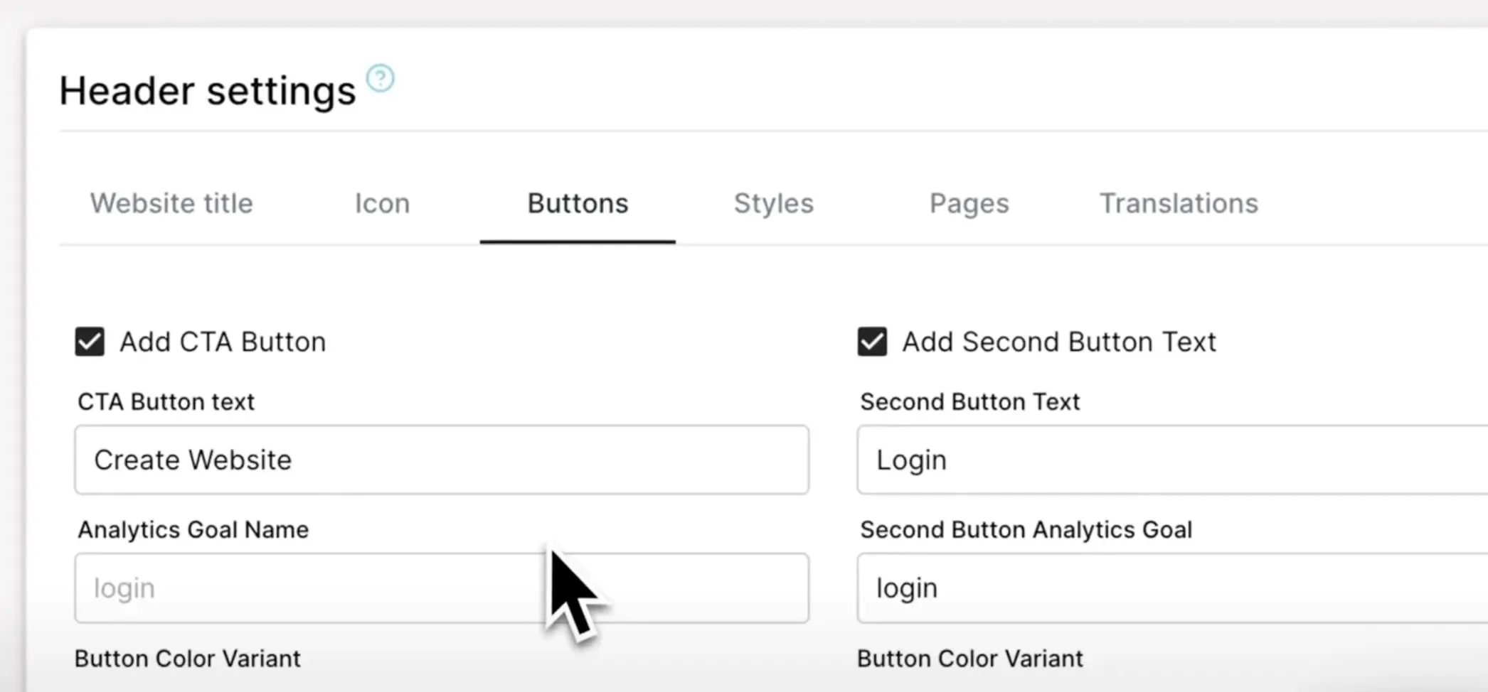 Next, you can add buttons to your header. You have the option to add one or two buttons, or remove them entirely. These buttons can be configured further. For instance, you could add a "Buy" button. To track clicks and conversions, add analytics tags as outlined in our Get Started documentation.
