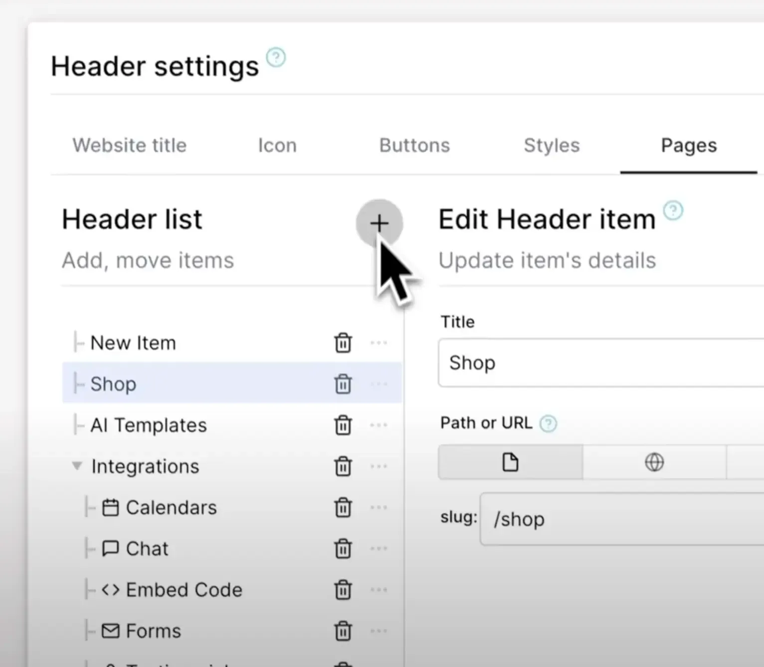 The header list includes the navigation items visible on your header. It’s simple to add new items, but keep in mind that space is limited. Aim for around four to five items to avoid overcrowding. You can nest items to create submenus, rearrange the order, and add icons or descriptions.