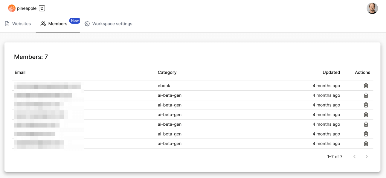 After collecting the first emails, you will see the list of Emails and Category groups from your "Main Dashboard," as this information is shared across all your website projects.