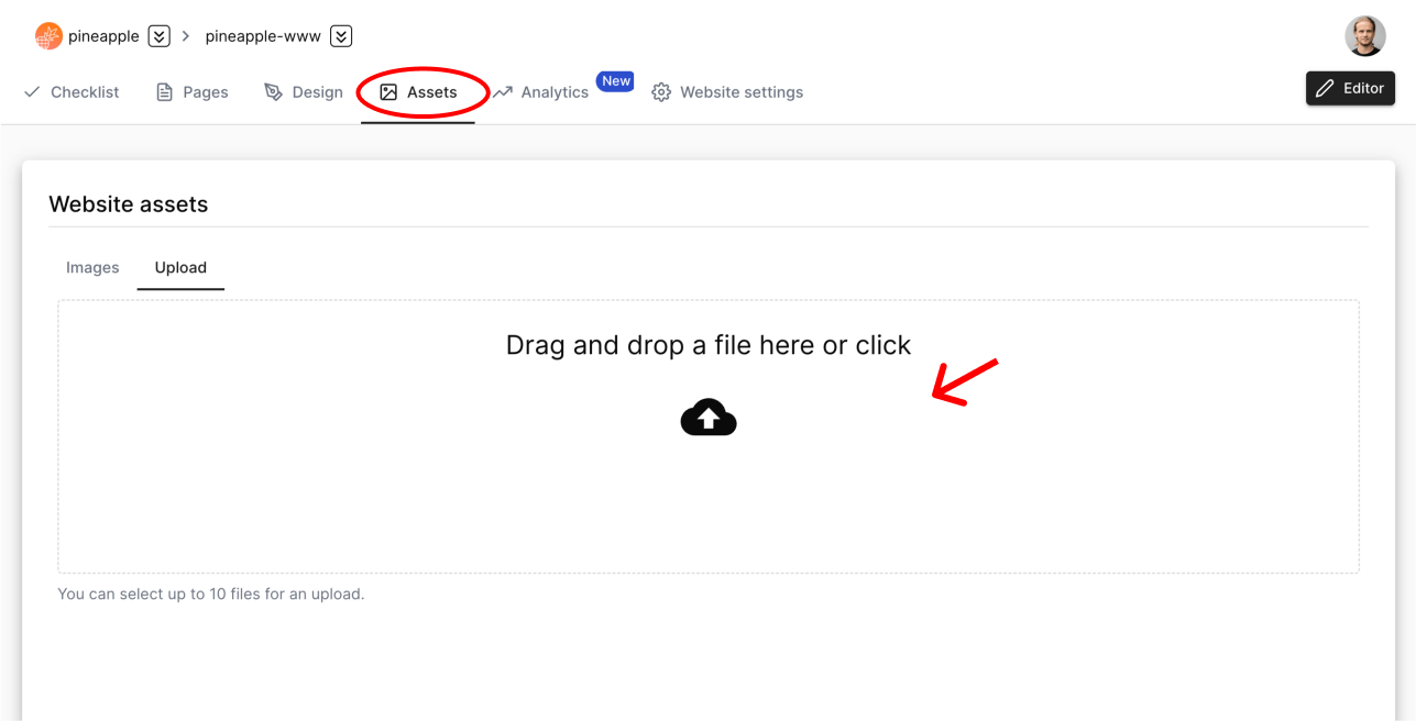 When you have all the files, you can navigate to your "Assets" from your Dashboard and pick "Upload" tab to upload your images