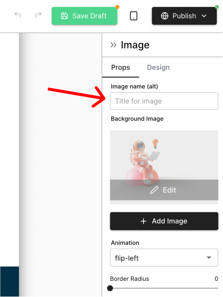 Pineapple Builder automatically reuse your image file name as alt image to make sure you always have it filled in. Nevertheless remember to give your images meaningful names! This will also help you with finding your images in our asset manager view.