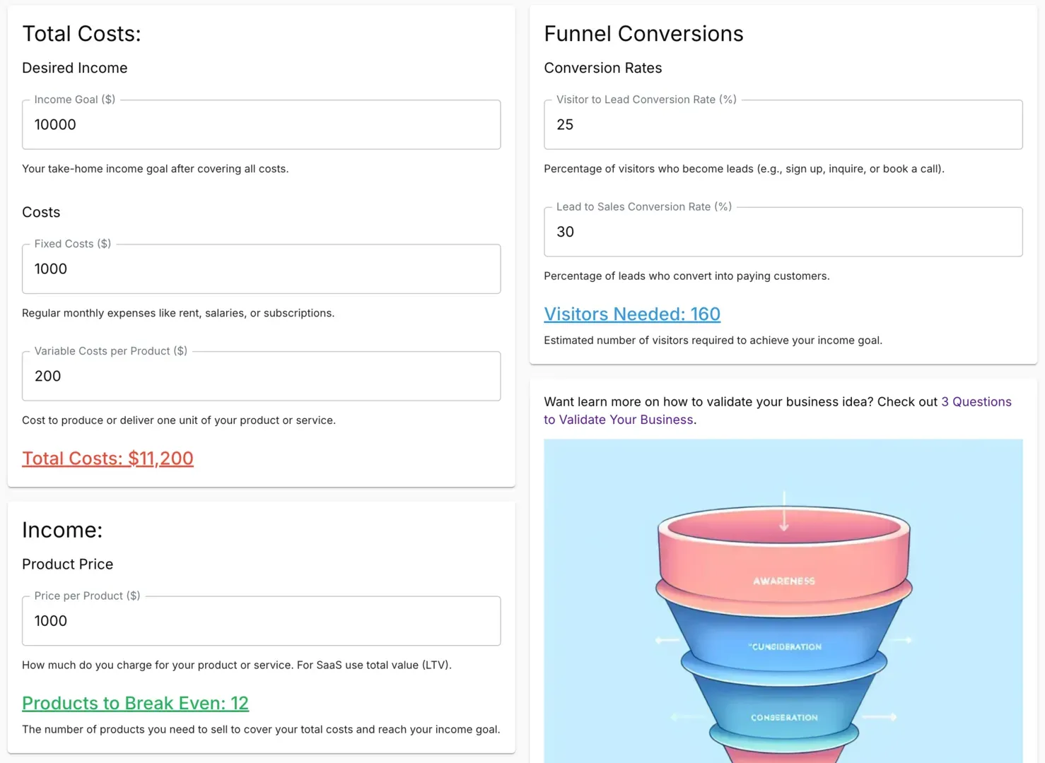 The Business Calculator will help you to solves these challenges. Whether you're launching a new product or trying to scale your existing business, this tool provides clarity on costs, pricing, and visitor goals.